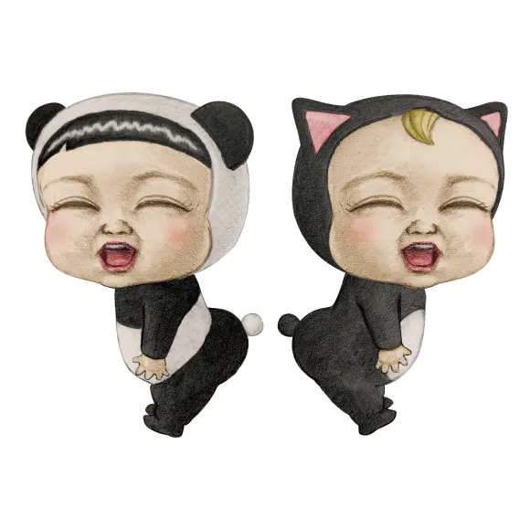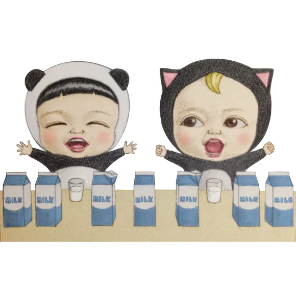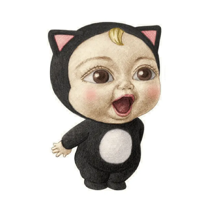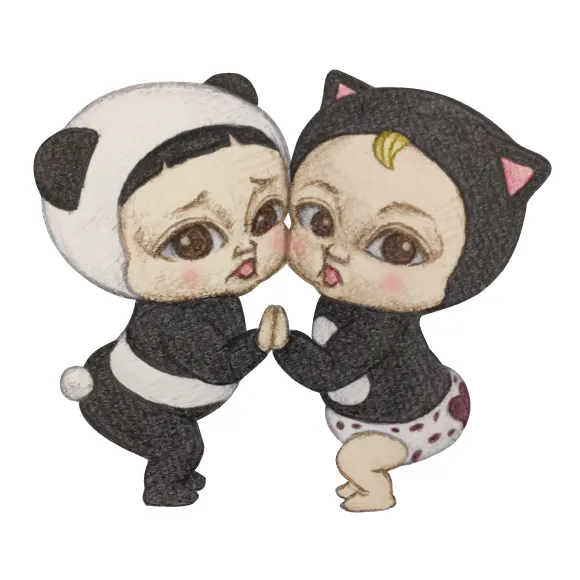The main characters are “Sadayuki”, a clumsy boy wearing a black cat costume, and “Masaru”, a laid-back boy wearing a panda costume. They are children have big beady eyes and adorable amused expressions that make you involuntarily crack a smile.